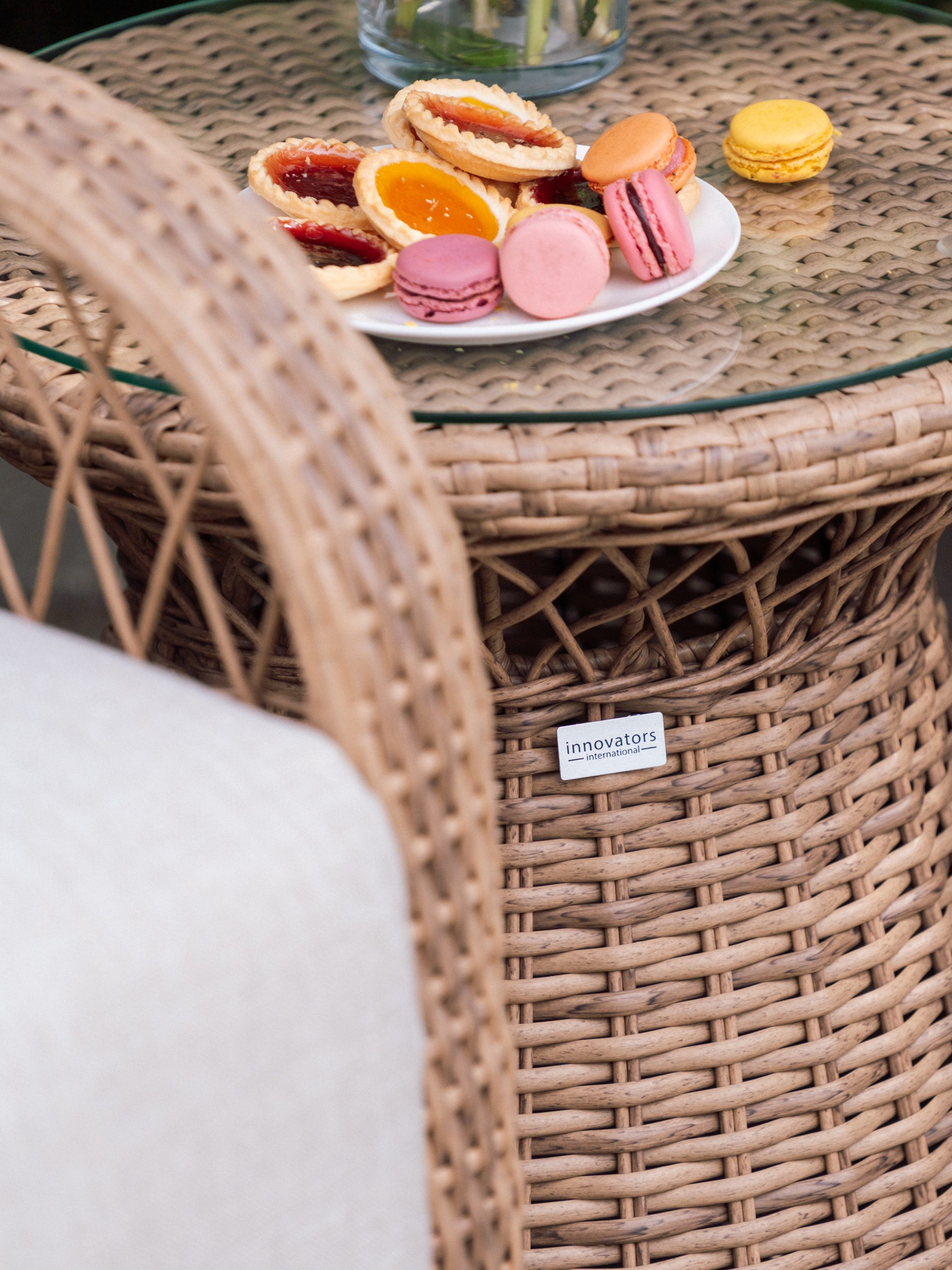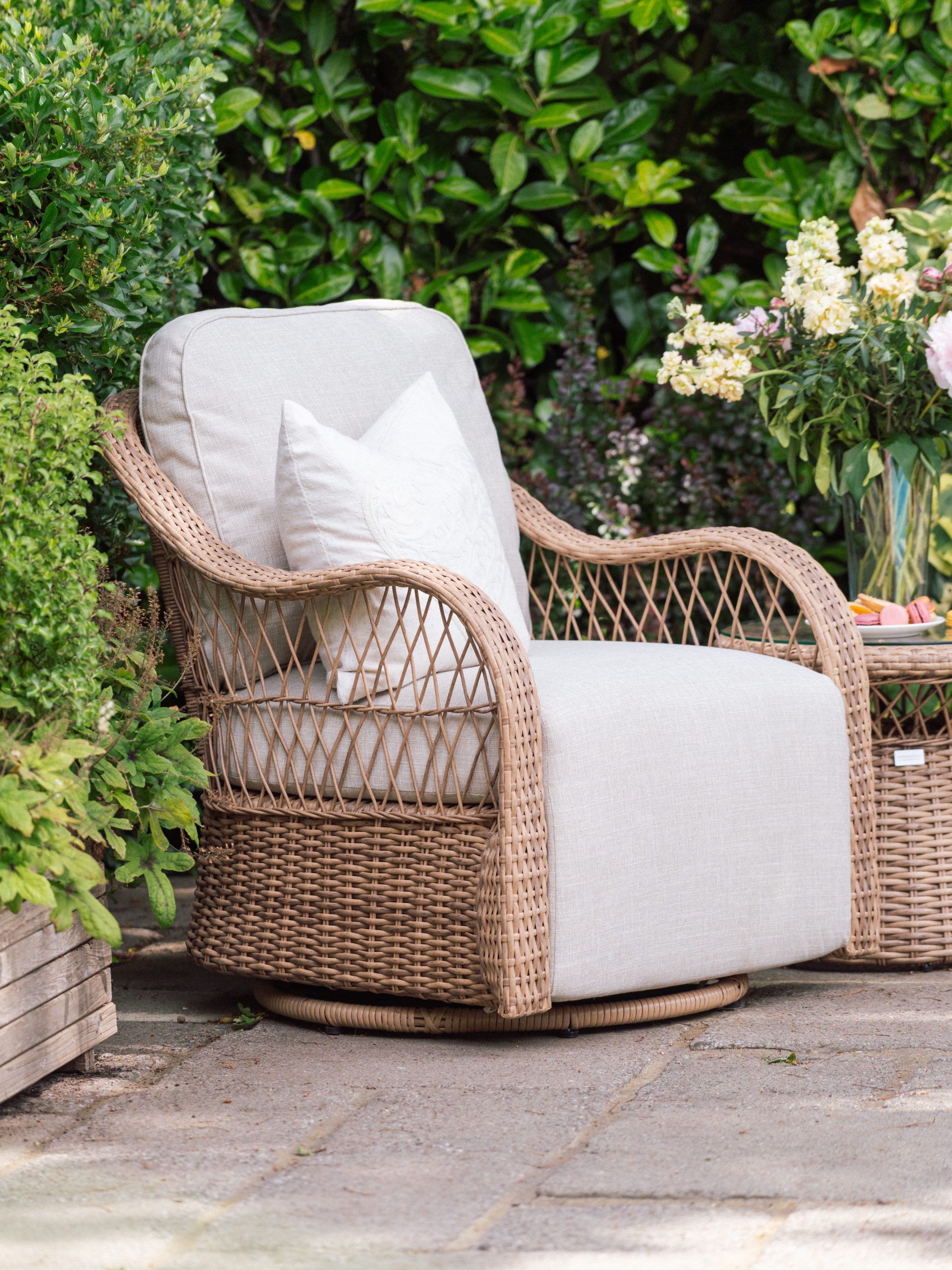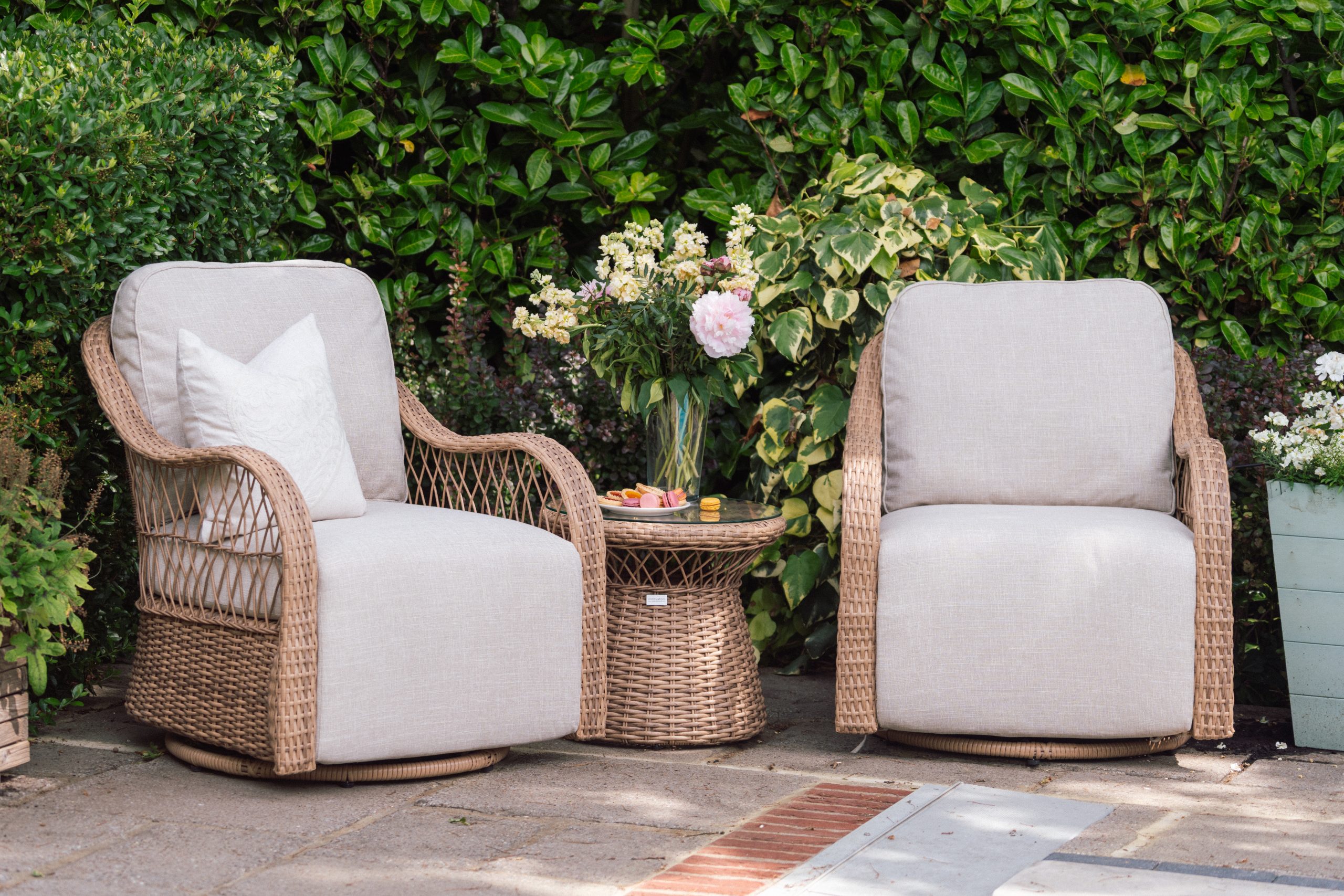The Elijah Swivel Rocking Bistro Set by Innovators features a beautifully crafted woven frame in a warm, natural tone. Therefore, it blends effortlessly into garden surroundings. Its curved armrests and smooth lines create a soft, inviting look. In addition, the intricate detailing adds a touch of sophistication while maintaining a relaxed outdoor feel.